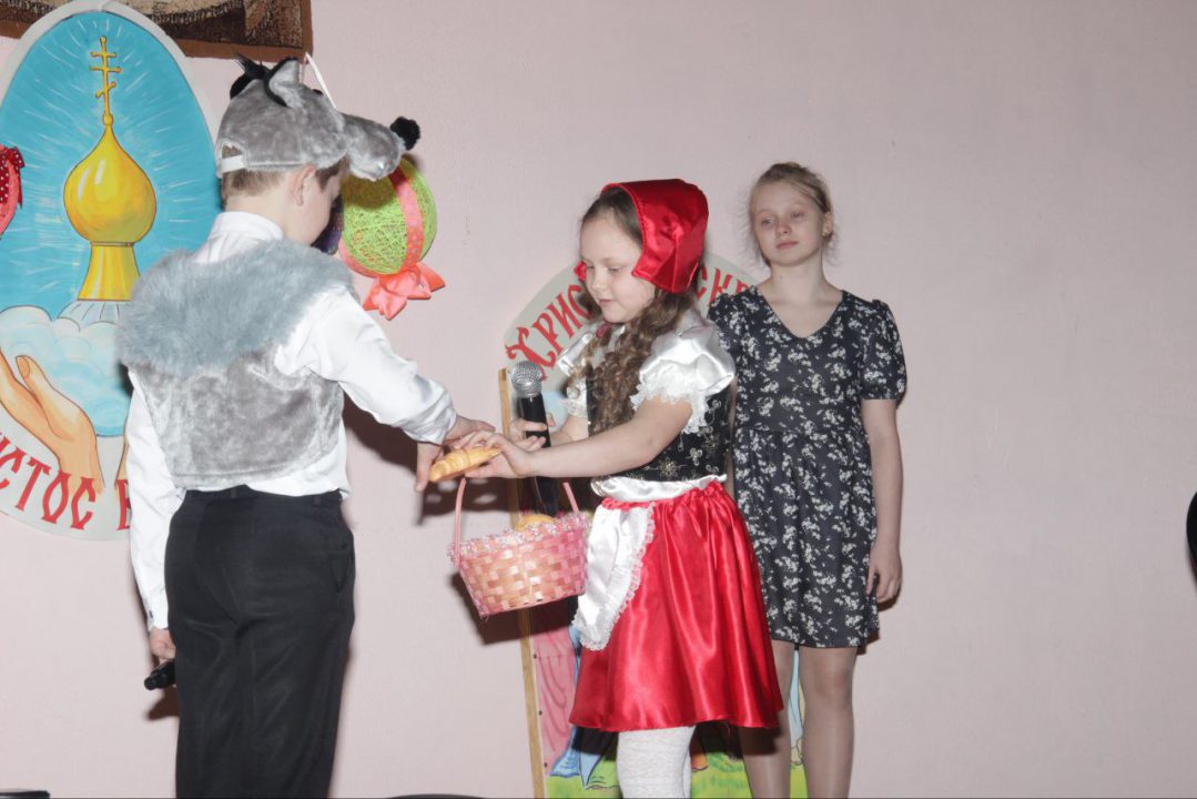 Воспитанники Воскресной Школы показали пасхальную сценку про Красную шапочку и порадовали гостей своим и песнями и танцами. В гости прославить воскресшего Христа пришли дети из детского сада Гнёздышко пгт Белый Городок, дети из Белогородской СОШ, дети из Приволжской Школы, дети ансамбля «Радуйся» Кимрской муз.школы, дети с особенностями из Кимрского объединения «Доброе дело» и другие дети. Все гости пришли со своими номерами, где они пели, читали стихи, играли на муз. инструментах, танцевали и прославляли Пасху и Христа. В празднике приняло участие почти 60 детей, не считая взрослых. Получился концерт, наполненный воистину Пасхальной радостью. После представления дети получили подарки и приняли участие в чаепитии.